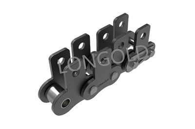 将原来的免加油耐热规格和食品机械专用免加油规格链条统一整合后形成的规格,链条两侧带有单孔折弯板附件。可在常温到230℃的广泛温度环境下使用,并且可用于输送食品的绿色环保免加油带附件的链条。