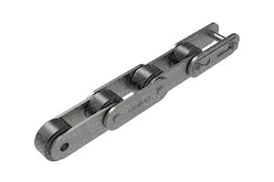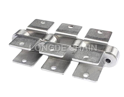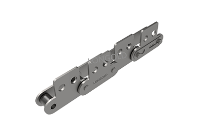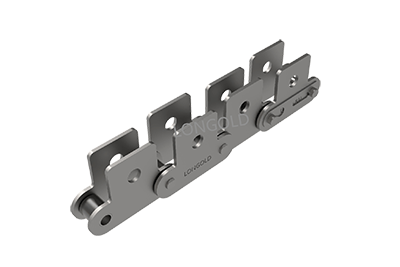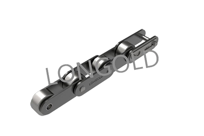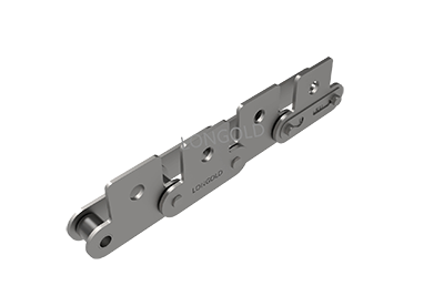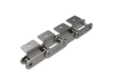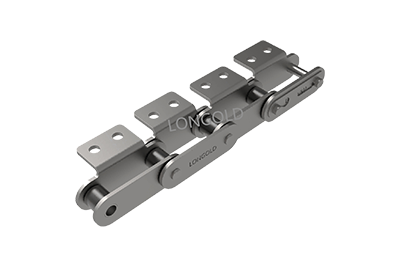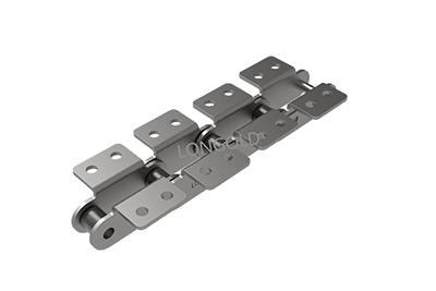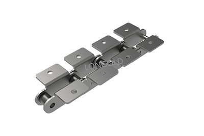 与短节距A系列滚⼦链条相⽐,链条节距增加1倍(称为双倍节距),链板形状为直板形,链条的滚子分为S型滚子和R型滚子,且带附件的输送⽤链条。