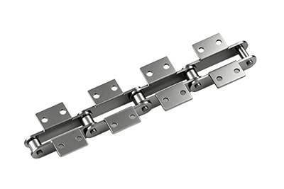 在12200·12250米制节距大型输送链条的单侧作特殊形状和开孔的链条。附件是为了将夹具安装在链条上的零部件,可根据客户要求设定安装间隔。单侧链板上带有螺孔,附件表示为:GA2、GA4。