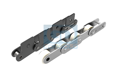 本体链条为双倍节距输送链,链条滚子为特殊工程塑料制R滚子,比普通工程塑料滚子噪音更低。本体链条可为普通规格,镀镍规格和SS不锈钢规格。