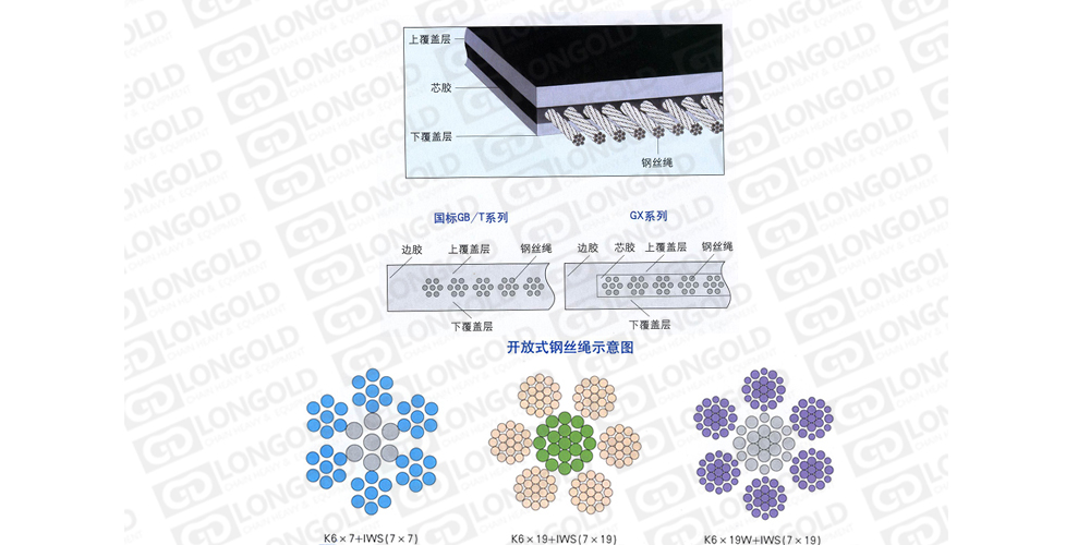 采用开放式的钢丝绳,使橡胶更好地渗透到钢丝帘线的间隙之中,可避免钢丝帘线内部存有空气,既能增强钢丝的耐腐蚀能力,又能提高其与橡胶间的粘合强度,提高输送带耐动态疲劳性能,延长了产品使用寿命。
